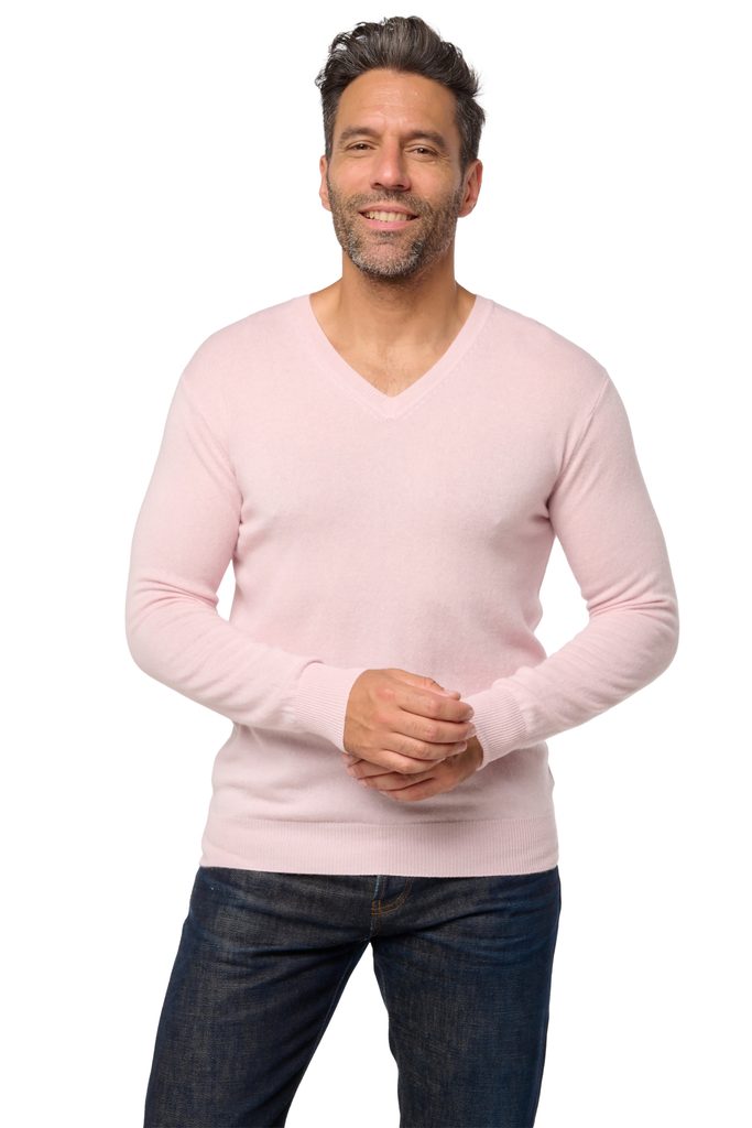 V-aukkoista neuletta voi pitää paidan päällä tai suoraan iholla, jolloin voit tuntea kashmirin pehmeyden.